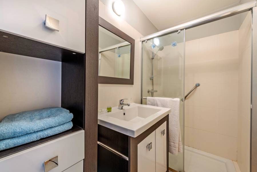 - salle de bain avec douche à l'italienne et lavabo.